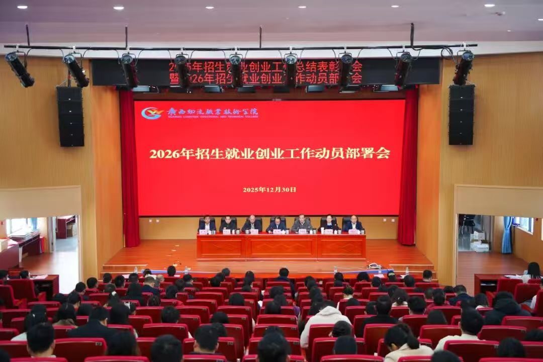 12月30日,我校召开2025年招生就业创业工作总结表彰大会暨2026年招生就业创业工作动员部署会。学校党委书记漆辉,党委副书记、校长朱海强出席会议并讲话,党委副书记、工会主席杨一笔宣读表彰文件。领导班子成员覃丽燕、陈继文、陈赋光参加会议。党委委员、副校长、宣传部部长梁杰主持会议。漆辉向受表彰的集体和个人表示热烈祝贺,肯定了2025年学校招生就业创业工作的显著成效。针对2026年工作,他强调,一要优化生源结构、提升招生质量,...