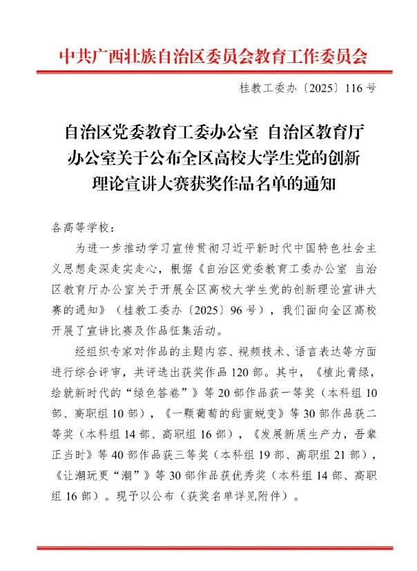 近日,广西八桂职教网公布2025年度新闻宣传类奖项评选结果,我校凭借扎实的宣传工作基础、优质的宣传成果输出,再度斩获多项殊荣,实现连续四年蝉联相关表彰的优异成绩!具体获奖情况如下: