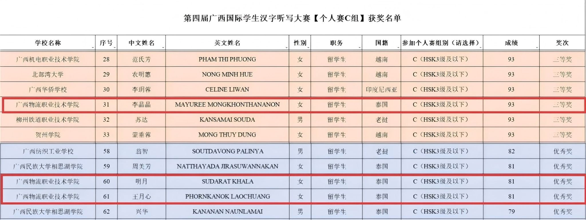 6名泰国留学生代表学校参赛,凭借扎实的汉字功底与良好的临场表现,在个人赛和团体赛中斩获佳绩。个人赛中,我校留学生李晶晶荣获C组三等奖,明月、王月心获得C组优秀奖。团体赛中,黄英、李晶晶、明月组成的团队,斩获乙组三等奖。