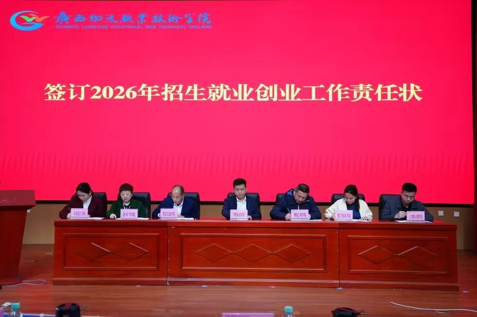 会上,学校领导班子成员为2025年就业工作先进集体、先进个人,2025年中国国际大学生创新大赛广西赛区获奖师生团队颁发荣誉证书,并为2026年第一批大学生创新创业教育实践基地授牌。学校与二级学院签订2026年招生就业创业工作责任状,明确工作目标与责任。