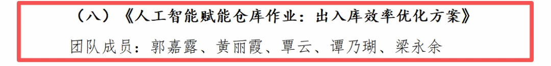 经过激烈角逐,由我校人工智能与大数据学院黄丽霞、覃云、郭嘉露、谭乃瑚、梁永余等教师组成的项目团队,凭借作品《人工智能赋能仓库作业:出入库效率优化方案》,在决赛中表现突出,荣获大赛优秀创意奖。