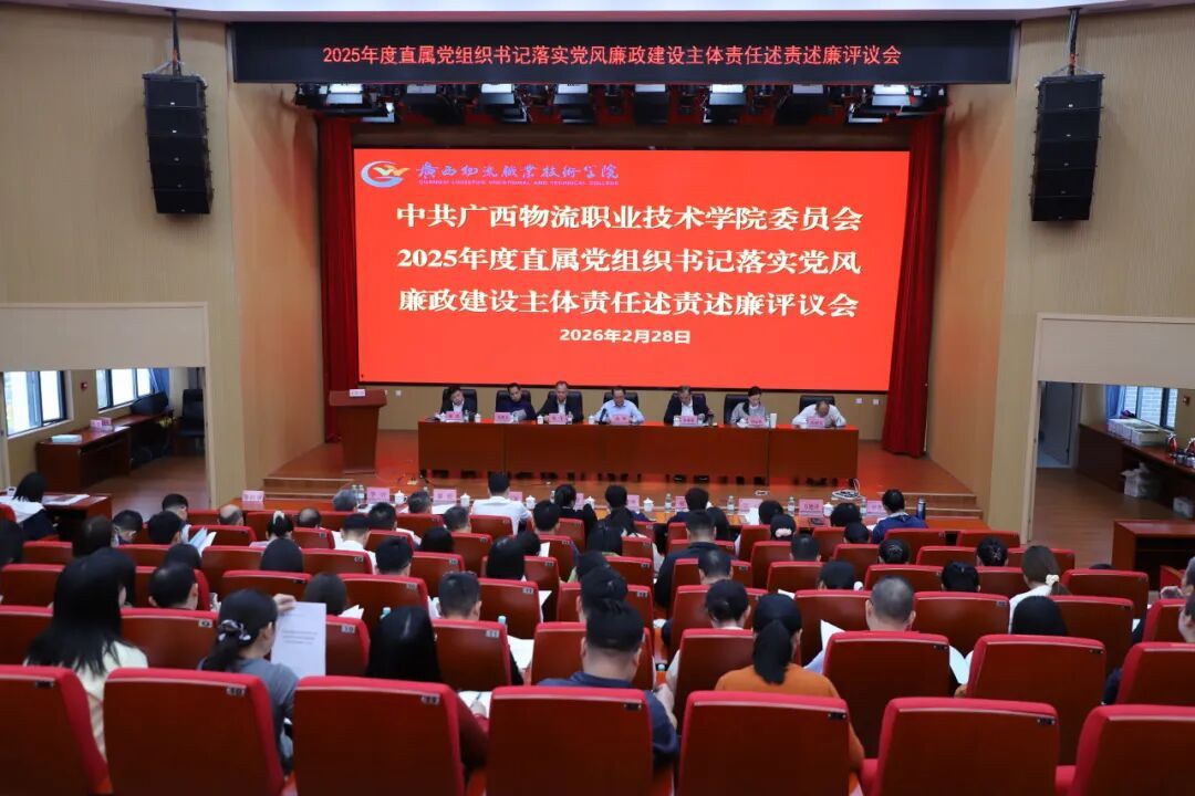 2月28日,广西物流职业技术学院党委召开2025年度直属党组织书记抓基层党建工作述职和落实党风廉政建设主体责任述责述廉评议会,听取各直属党组织书记抓基层党建工作、落实党风廉政建设主体责任工作情况,并进行民主评议。集团公司党群工作部(党委宣传部、党委统战部)部长江孙裕到会指导。学校党委书记漆辉主持会议并作点评讲话,学校党委领导班子成员朱海强、杨一笔、覃丽燕、陈继文、陈赋光、梁杰出席会议。