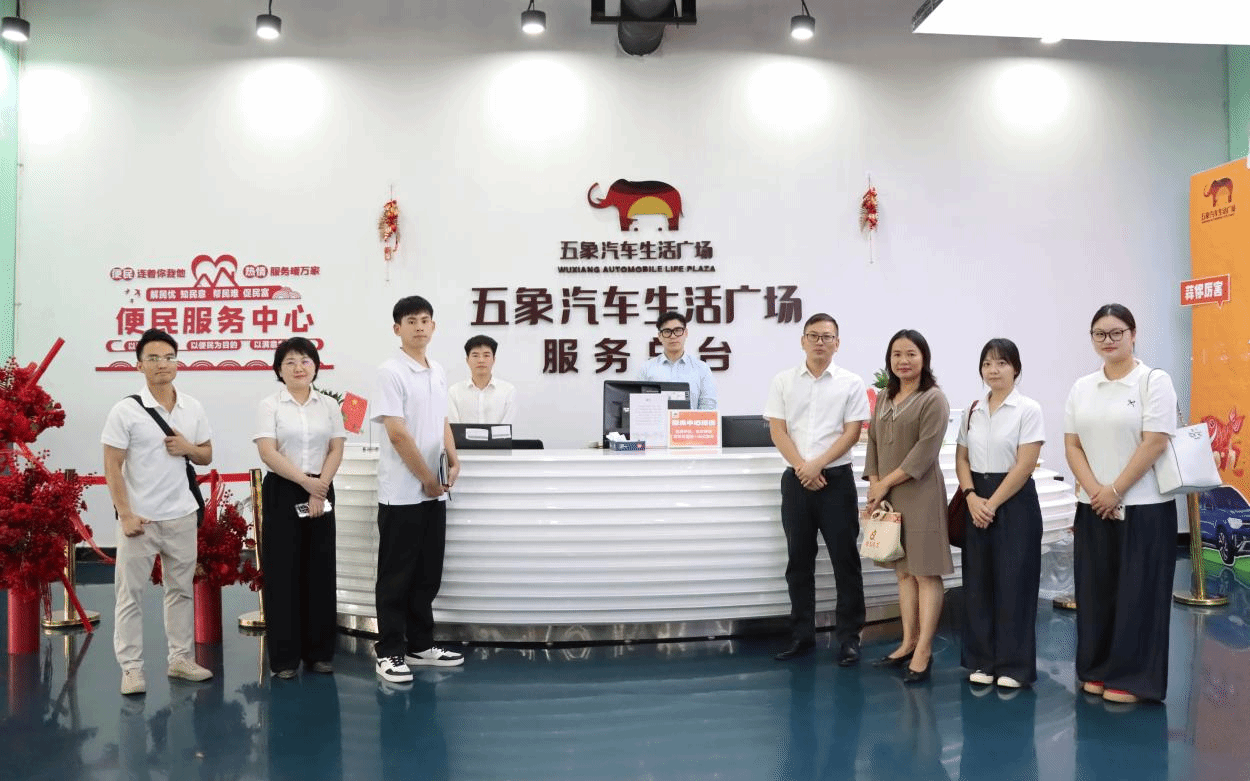 在广西桂物机电集团有限公司五象汽车生活广场,调研团队深入考察了这个广西最大的一站式汽车文旅生活综合体的运营模式。作为自治区服务业重点项目,五象汽车生活广场整合了整车展销、后市场服务、汽车文化等五大功能区域。调研组重点考察了广场的电商服务模式和数字化运营体系。