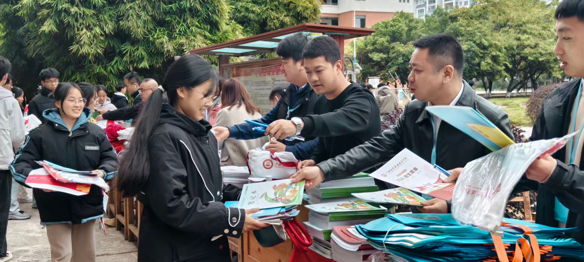 ▲我校教师分发招生宣传资料