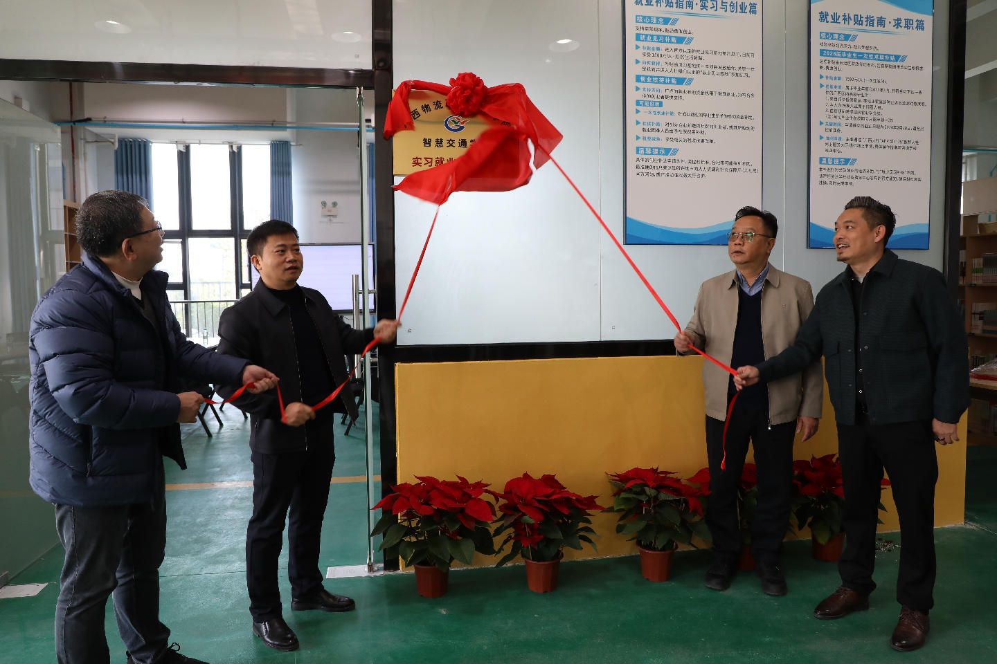 1月8日上午,智慧交通学院大学生实习就业指导中心与校友联络站揭牌仪式在二号实训楼举行。学校党委委员、副校长、宣传部部长梁杰,自治区人社厅就业服务中心主任黎经宇出席揭牌仪式,并与校企相关人员一同揭牌。