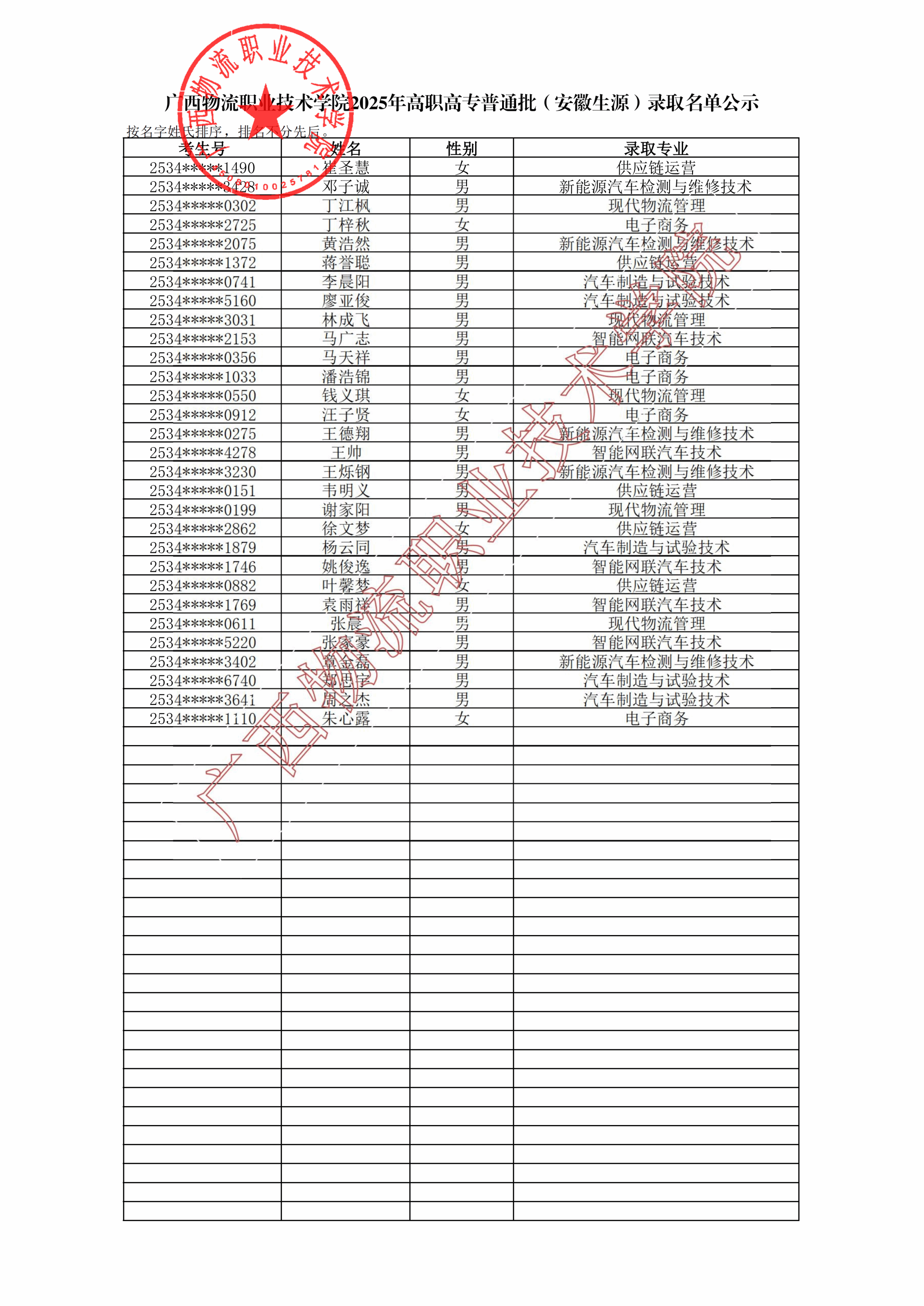 广西物流职业技术学院2025年高职高专普通批(安徽生源)录取名单公示