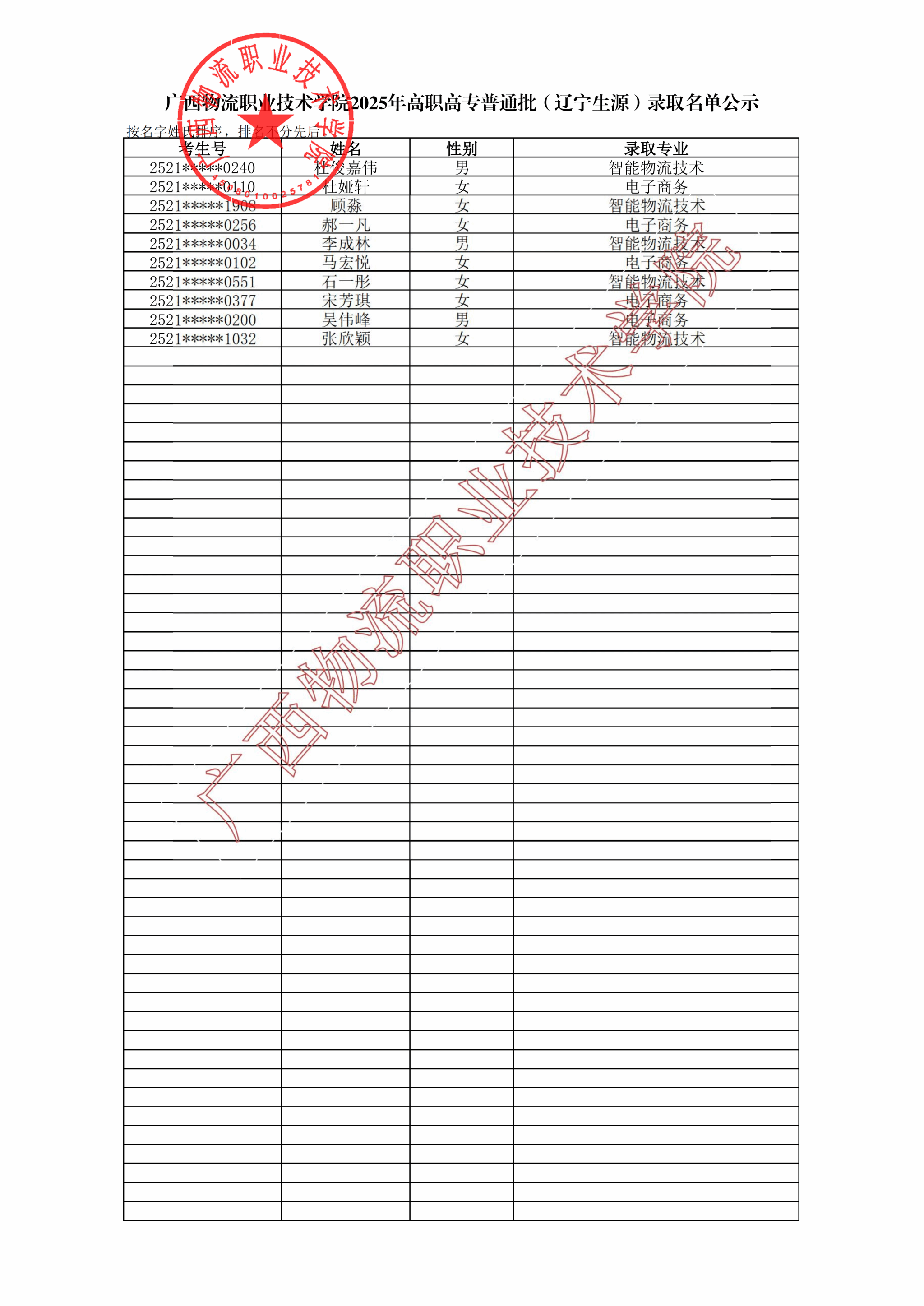 广西物流职业技术学院2025年高职高专普通批(辽宁生源)录取名单公示