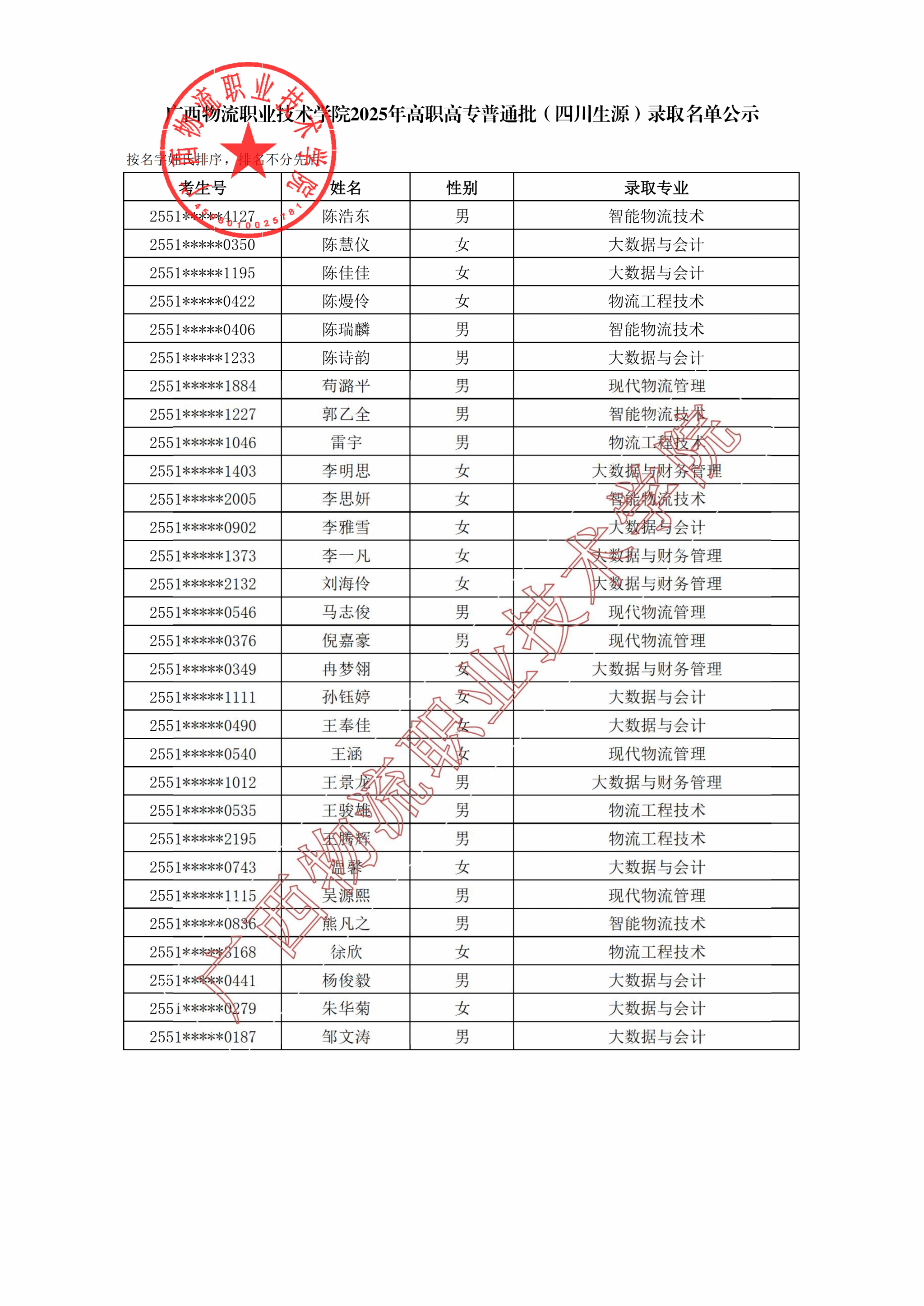 广西物流职业技术学院2025年高职高专普通批(四川生源)录取名单公示.pdf