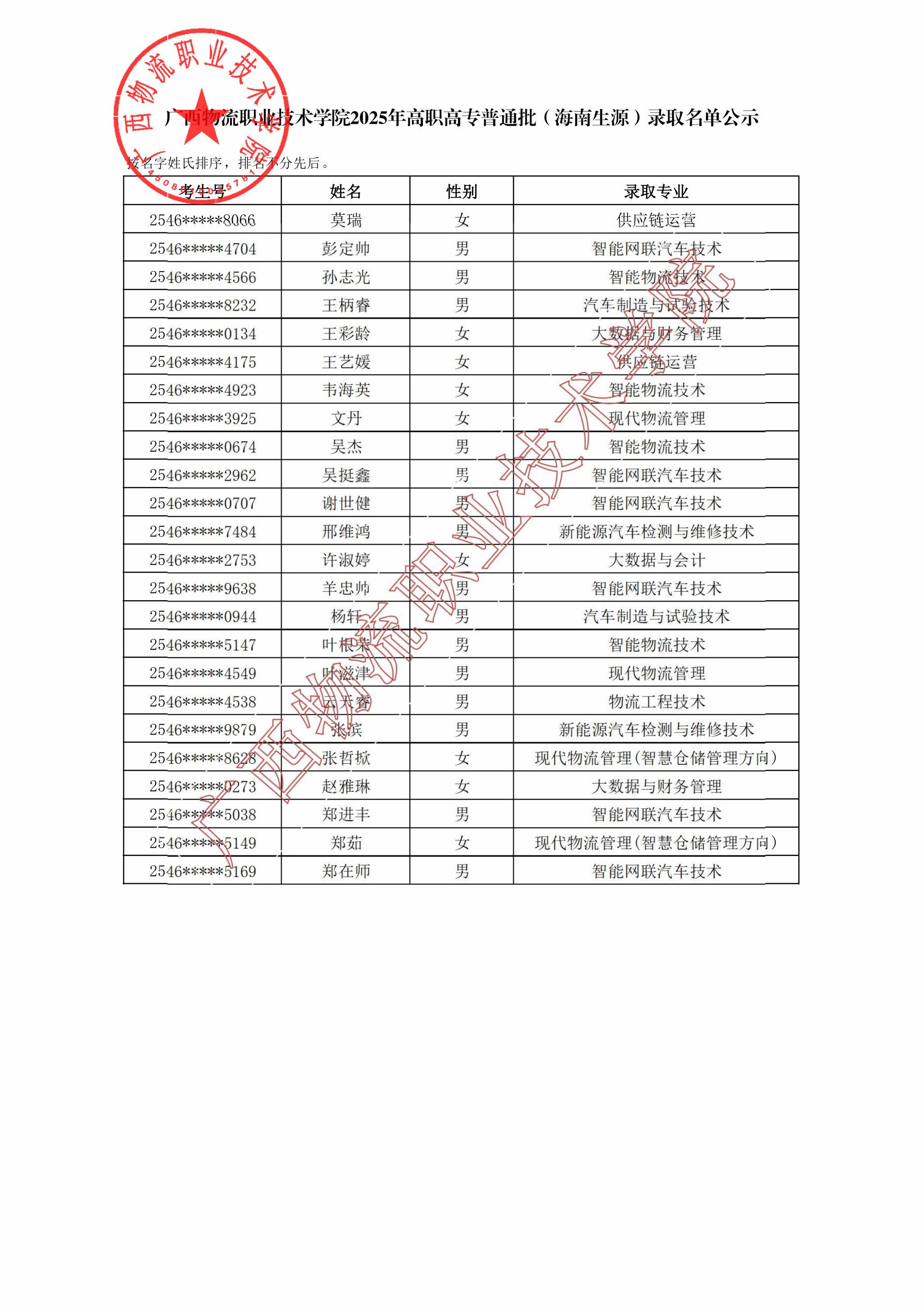 广西物流职业技术学院2025年高职高专普通批(海南生源)录取名单公示