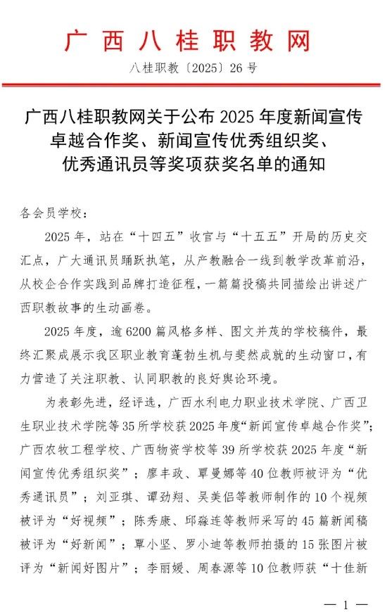 近日,广西八桂职教网公布2025年度新闻宣传类奖项评选结果,我校凭借扎实的宣传工作基础、优质的宣传成果输出,再度斩获多项殊荣,实现连续四年蝉联相关表彰的优异成绩!具体获奖情况如下: