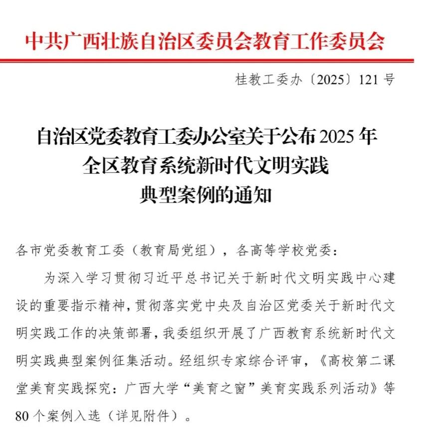 近日,自治区党委教育工委办公室印发《关于公布2025年全区教育系统新时代文明实践典型案例的通知》,我校党委报送的《“田间地头变课堂”:农耕劳动实践育新人》案例成功入选。