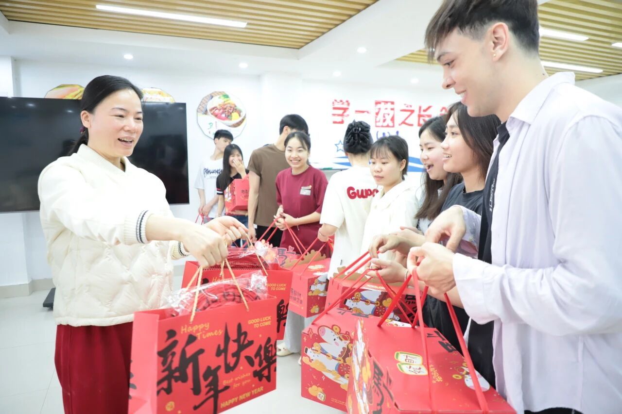 漆辉、覃丽燕为国际学生们送上新春祝福和节日礼品,希望他们在学校这个大家庭中收获知识、收获友谊、收获成长,度过一段难忘而有意义的求学旅程。