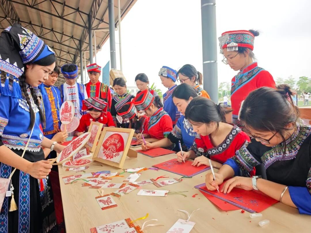 更有非遗剪纸DIY ,一张红纸在指尖翻转,化为福字、花鸟,传承着非遗技艺的灵动神韵。壮锦冰箱贴、壮锦扇制作让千年壮锦纹样焕发新生,成为兼具实用与纪念意义的文创好物。