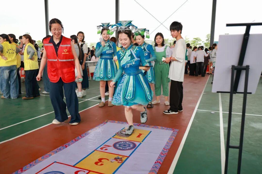 “开合、开开合!”伴随着清脆悦耳的竹竿敲击声,竹竿舞体验活动吸引了最多目光。同学们踏着节拍,敏捷地在竹竿间跳跃穿梭,展现出惊人的默契与青春活力。