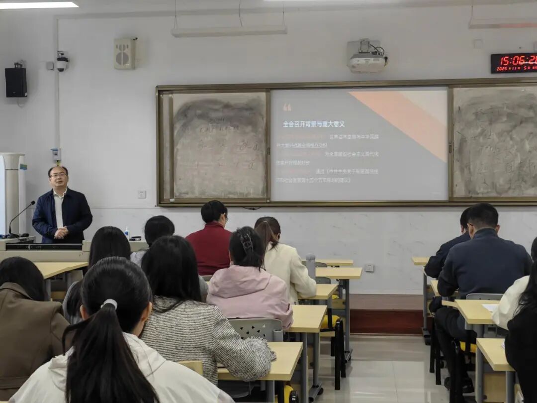 学校党委理论宣讲团以《深悟党的二十届四中全会精神实质 扛起“十五五”奋进新使命》为题,紧扣习近平总书记在党的二十届四中全会上的重要讲话精神和《中共中央关于制定国民经济和社会发展第十五个五年规划的建议》,系统阐释党的二十届四中全会的重大意义,深入解读“十五五”时期在基本实现社会主义现代化进程中的重要地位,全面阐述了“十五五”时期经济社会发展的指导方针、主要目标、战略任务和重要举措,结合大量实例和数据,生动诠释了全会作出的战略部署对推动国家发展、民族复兴的深远影响。