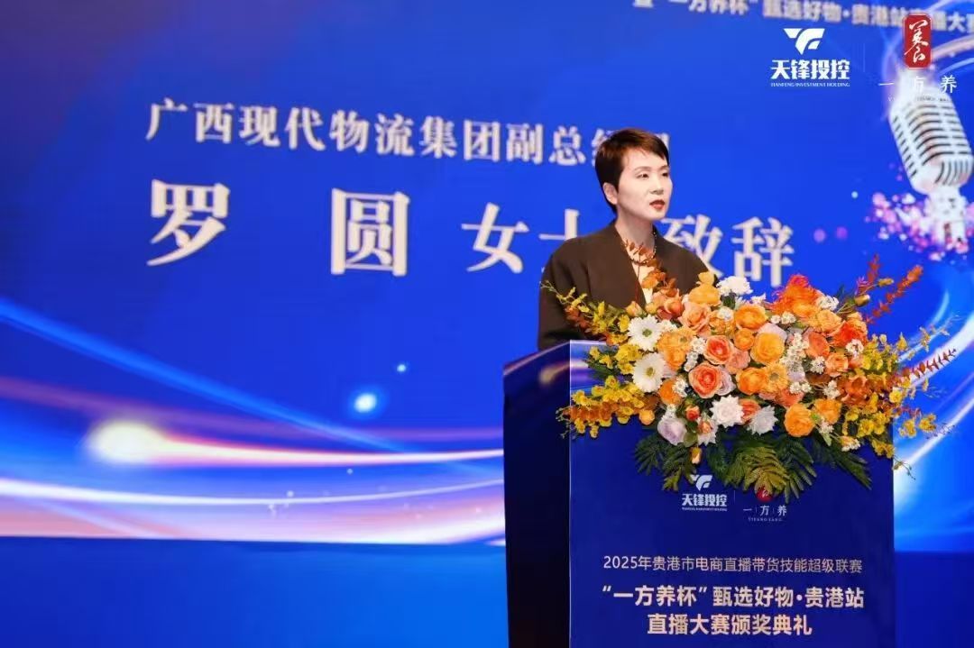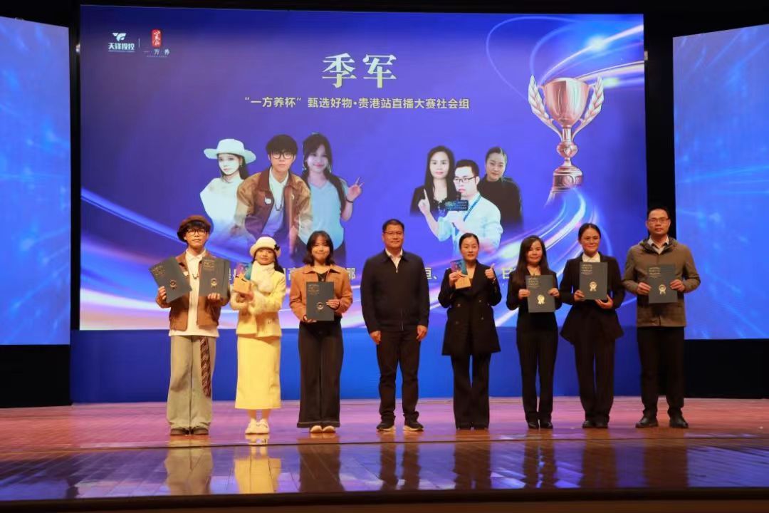 12月28日,贵港市电商直播带货技能超级联赛暨“一方养杯”甄选好物直播大赛颁奖仪式在贵港市政府会议中心举行。贵港市委常委、统战部部长周春涌,副市长农卓松,广西现代物流集团党委委员、副总经理罗圆,广西物流职业技术学院党委委员、副校长、宣传部部长梁杰,贵港市商务局局长张美玲,港北区委常委、统战部部长秦一翔,港北区人大常委会副主任宁鸿出席活动并为获奖选手颁奖。