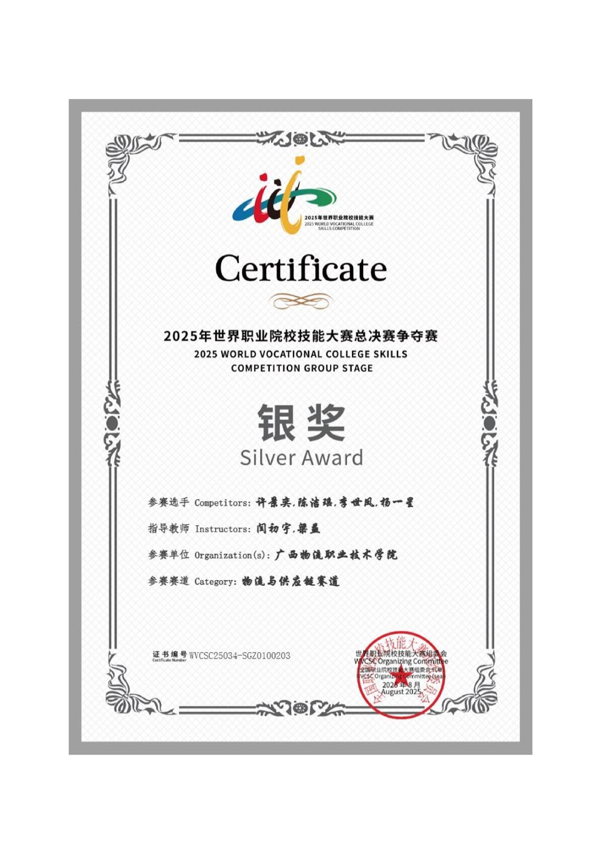 学校在2025年世界职业院校技能大赛总决赛中荣获物流与供应链赛道银奖、生态保护与环境治理赛道铜奖,办学第五年即登上了世赛(国赛)领奖台