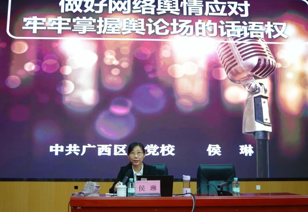 4月8日,中共广西区委党校侯琳教授应邀到我校开展“做好网络舆情应对 牢牢掌握舆论场的话语权”专题讲座。学校党委副书记、校长朱海强现场聆听讲座,党委委员、副校长陈赋光参加讲座。党委委员、副校长、宣传部部长梁杰主持讲座。