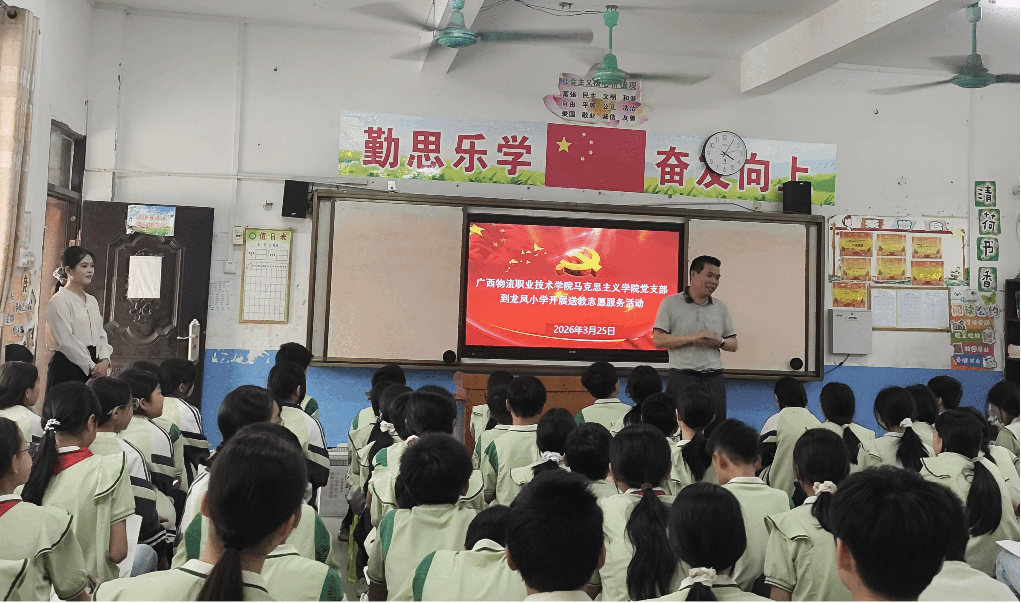 3月25日,马克思主义学院赴覃塘区龙凤小学开展送教志愿服务活动。活动中,马克思主义学院教师覃思惠以 “童眼看世界・同心护和平” 为题授课,她贴合儿童认知特点,结合案例融入雷锋故事,将雷锋精神与和平理念、互助友善品质相融合,让雷锋精神在孩子们心中落地生根。