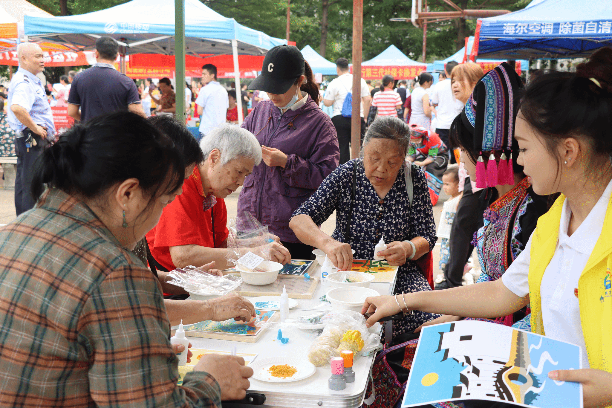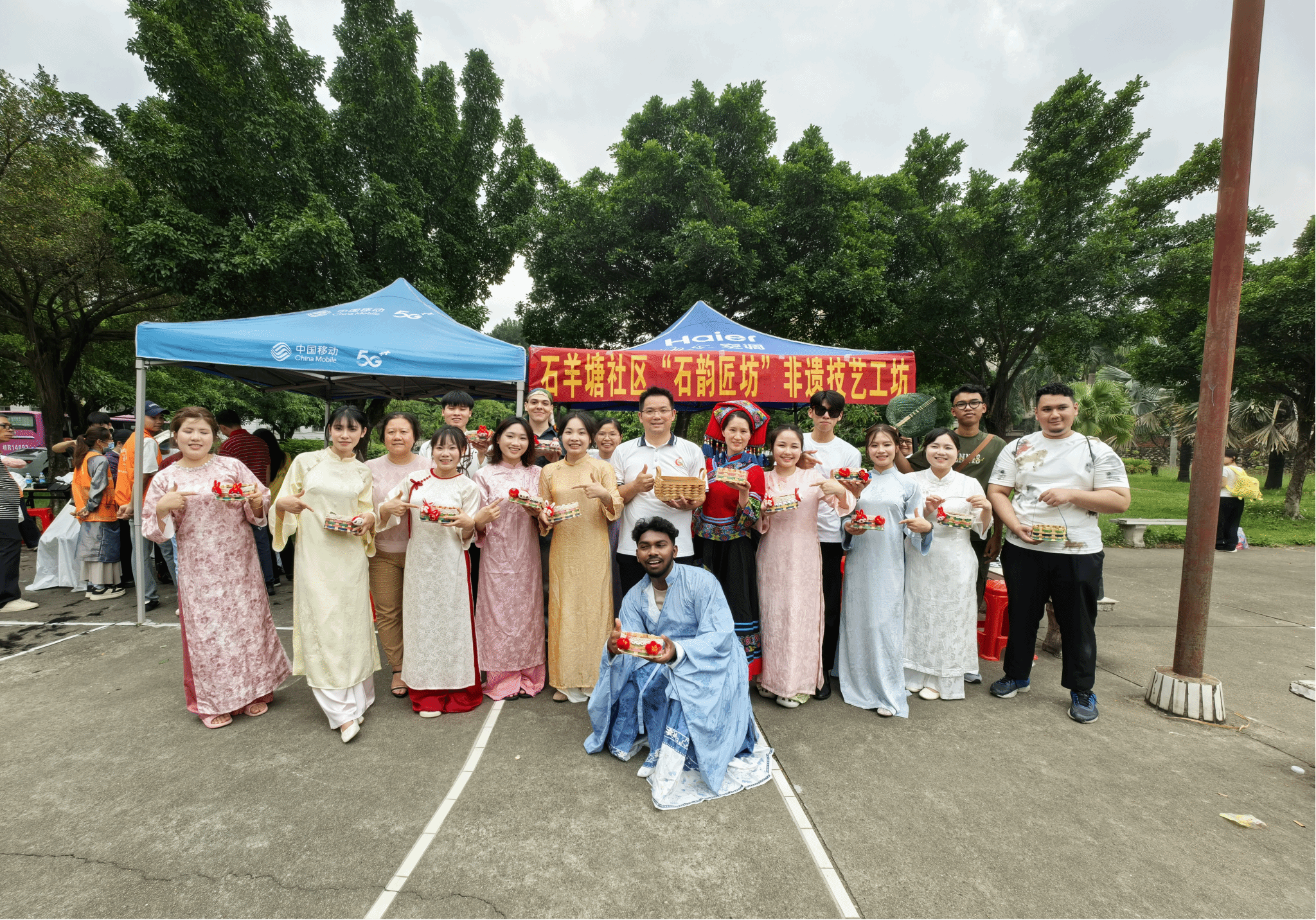 为让群众沉浸式感受“三月三”民俗魅力,活动现场专门设置了非遗手工体验区、民俗互动体验区,吸引了社区居民及学校国际交流学院留学生积极参与。抛绣球互动区里,居民们兴致盎然地体验壮族传统体育项目,在抛接之间感受竞技乐趣与民族特色;五色糯米饭品尝区中,师生志愿者亲手制作的五色糯米饭色泽鲜亮、香气浓郁,大家围坐在一起,一边品尝美食,一边分享各自家乡的节日习俗,欢声笑语间,拉近了彼此的距离,也让传统节日的氛围愈发浓厚。