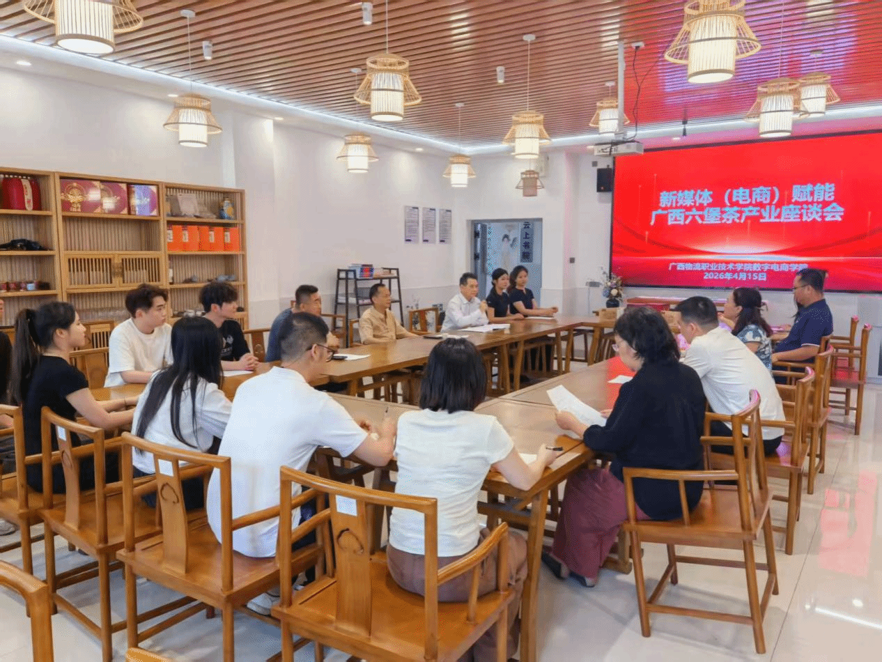 新媒体(电商)赋能广西六堡茶产业座谈会在活动期间召开,广西茶业协会副秘书长谢鸿桂、非遗六堡茶传承人陈伯昌、贵港市茶业协会会长黄敬新、正高级讲师陆秋菊,学校六堡茶创业团队参加会议。参会人员围绕政策赋能、运营打法、产教融合、品牌溢价、跨境布局等内容开展研讨。会上,非遗六堡茶大师团队与师生、茶厂师傅交流工艺改良,指导学生尝试“轻发酵+拼配创新”开发适合年轻人口味的快饮型六堡茶产品。