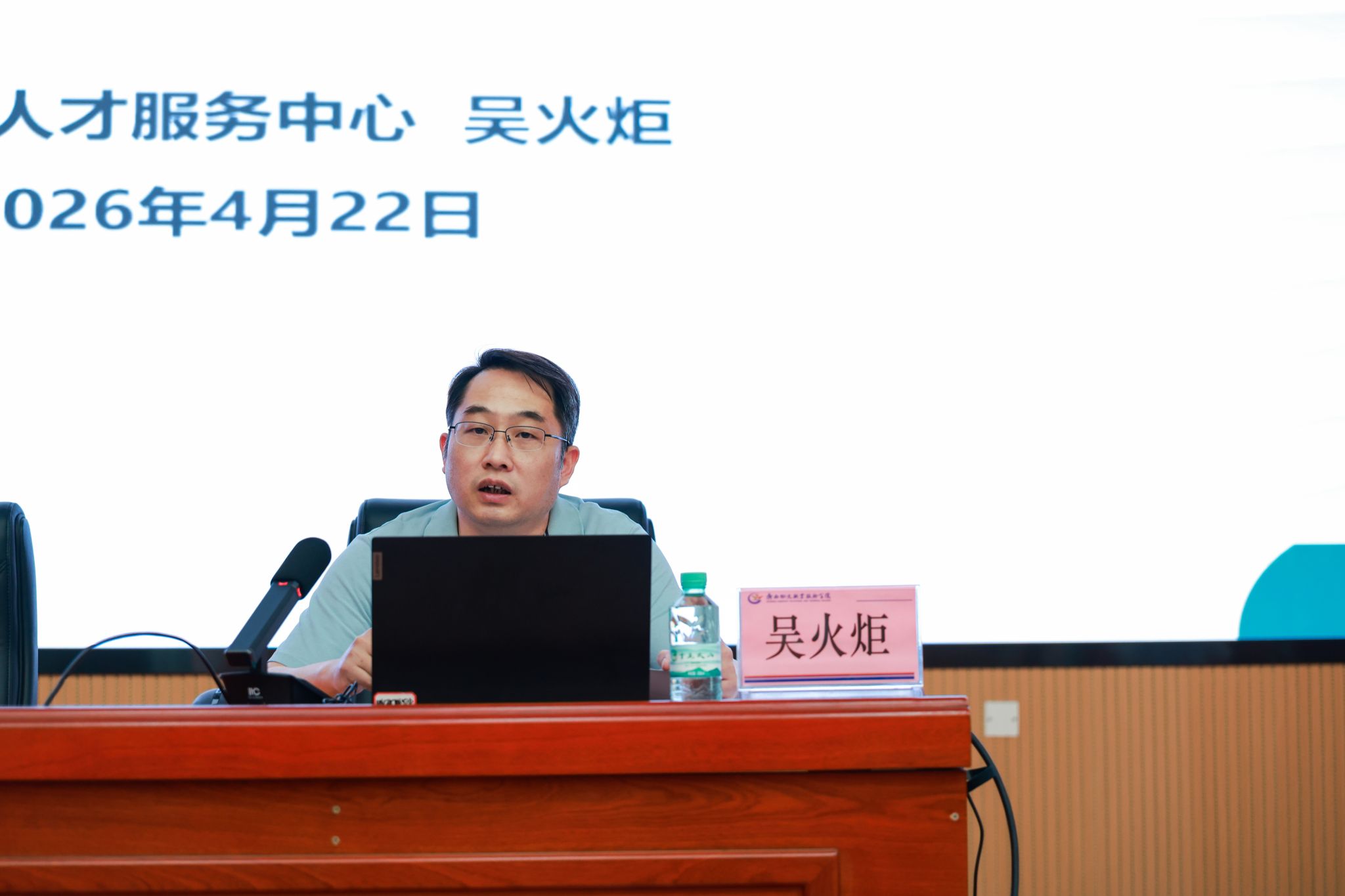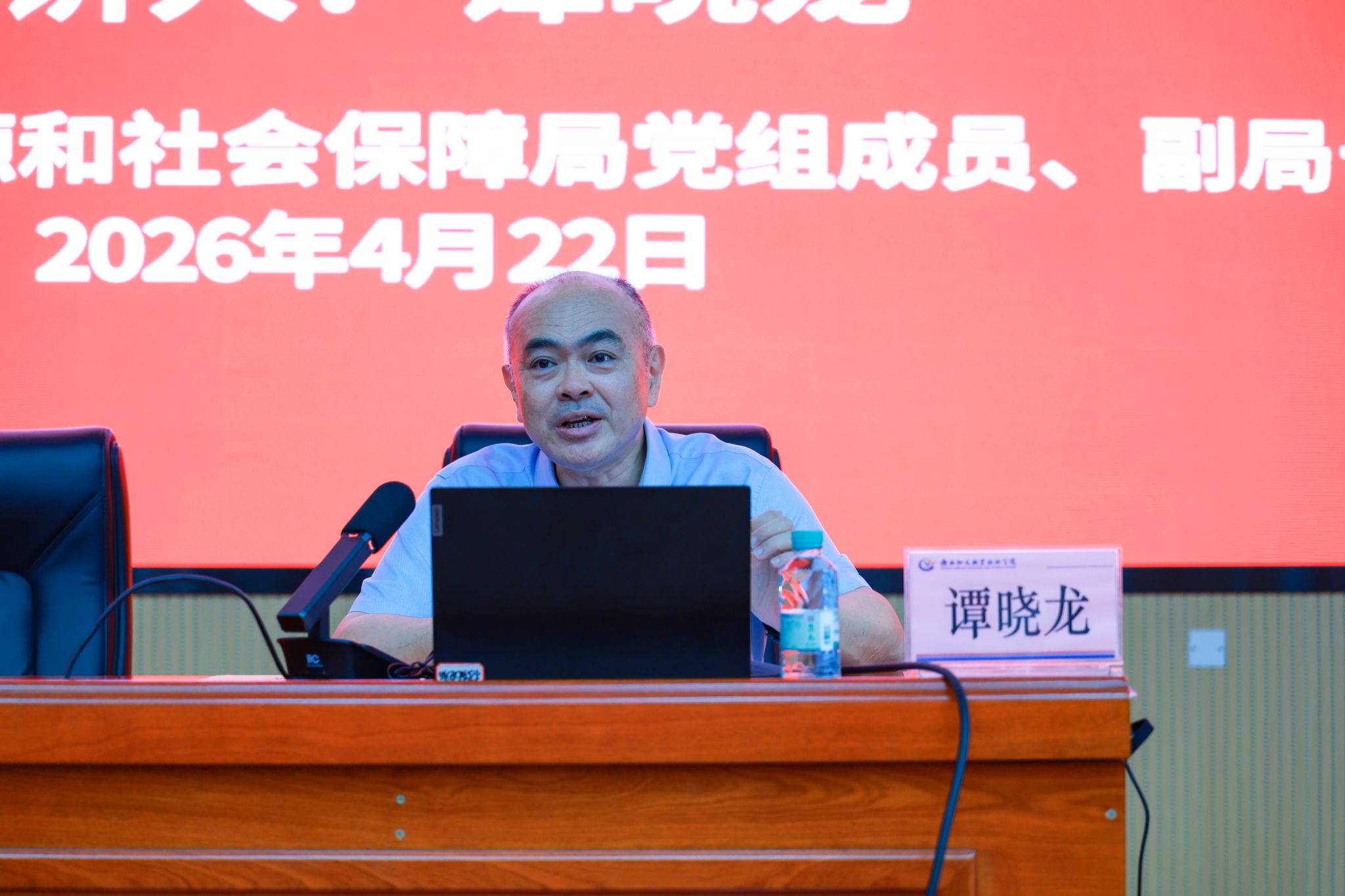 4月22日上午,我校在太行楼318报告厅举办2026年高校毕业生等青年就业创业政策专题讲座。贵港市人力资源和社会保障局党组成员、副局长谭晓龙,贵港市劳动人事争议仲裁院仲裁审理庭庭长黄灿敏,贵港市人才服务中心副主任吴火炬应邀到校开展专题讲座。党委委员、副校长梁杰主持讲座。